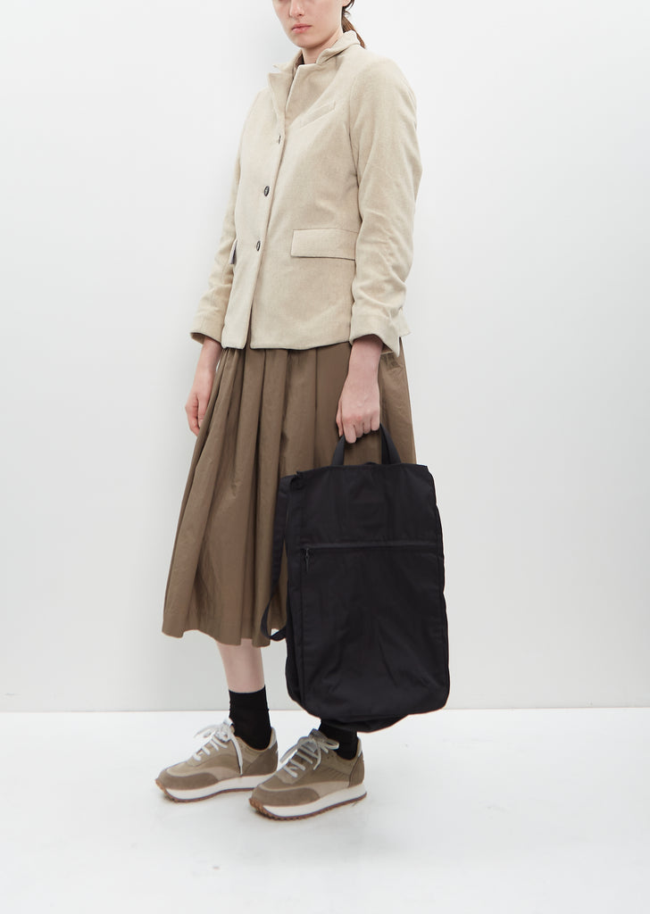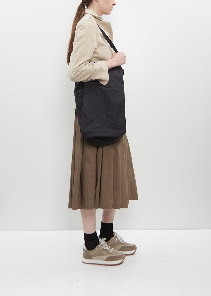 Amiacalva black tall large tote bag with four handles in nylon gabardine. Features top handles, shoulder straps, two interior slip pockets, two exterior zip pocket, gusseted base and sides, and a top snap buckle fastening. Comes unlined.