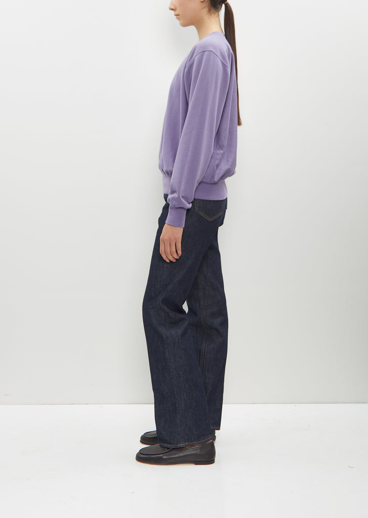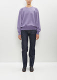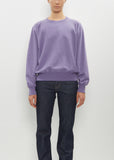 Auralee purple pullover sweatshirt in soft stretch cotton jersey with inner terry cloth lining. Features a round neck, side gusseted panels and rib trim at neck, cuffs and hem.