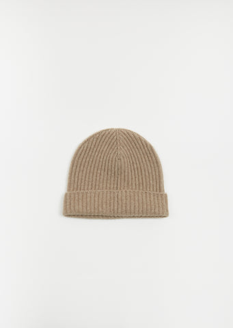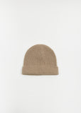 Begg x Co dark natural beanie in ribbed mid-gauge cashmere. Can be styled folded up or down.