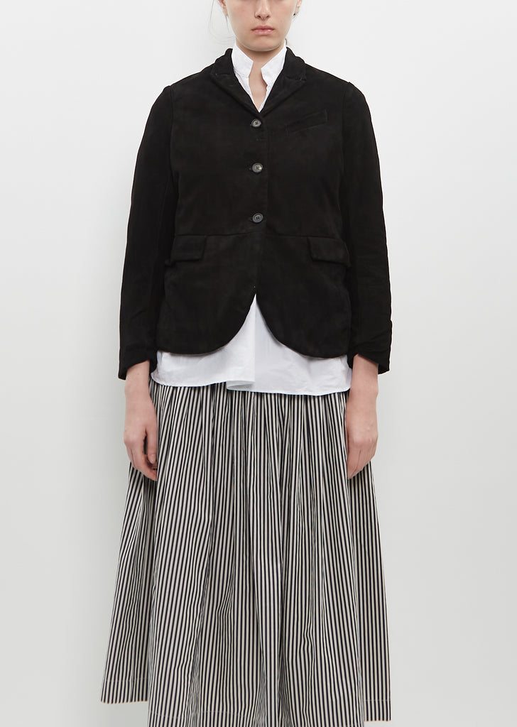 Bergfabel signature single breasted 3-button jacket with a closer fit in black suede leather. Features a rumpled effect at sleeves and back bodice, and a small notch collar that can be worn up or down. Flap side pockets and single welt chest pocket. Double vent at back. Finished with horn-hued buttons at front and two button sleeves. Comes fully lined in cotton.