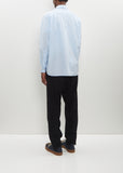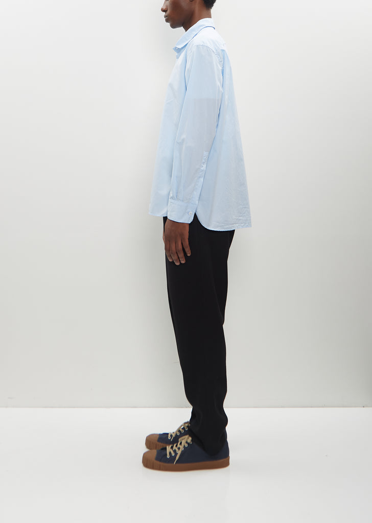 Bergfabel light blue shirt with classic shirt collar and shell-hued button front in cotton. Features side pleats at back yoke, pleated buttoned cuffs, and a slightly longer back hem.
