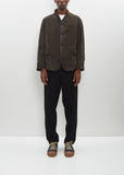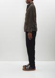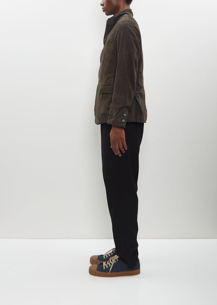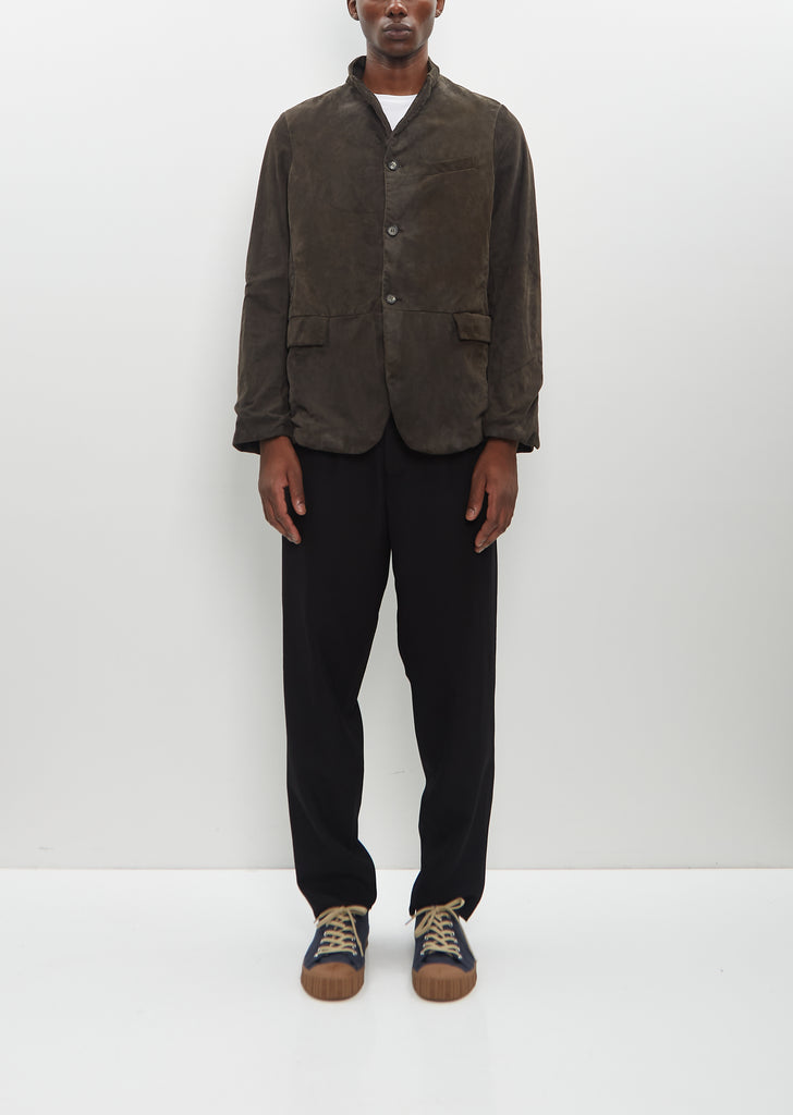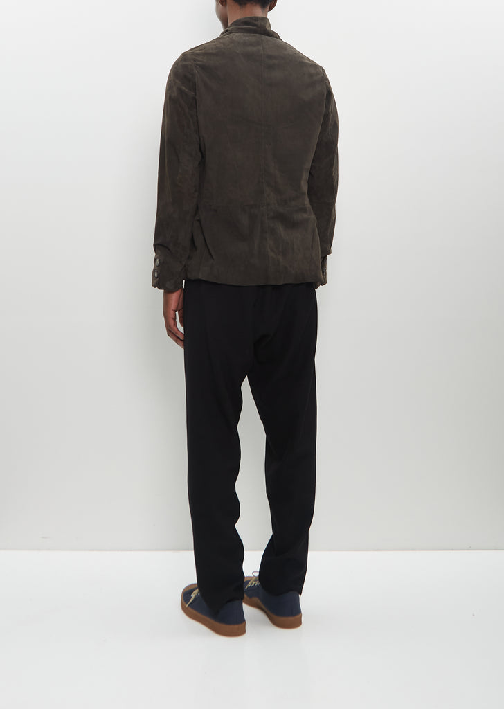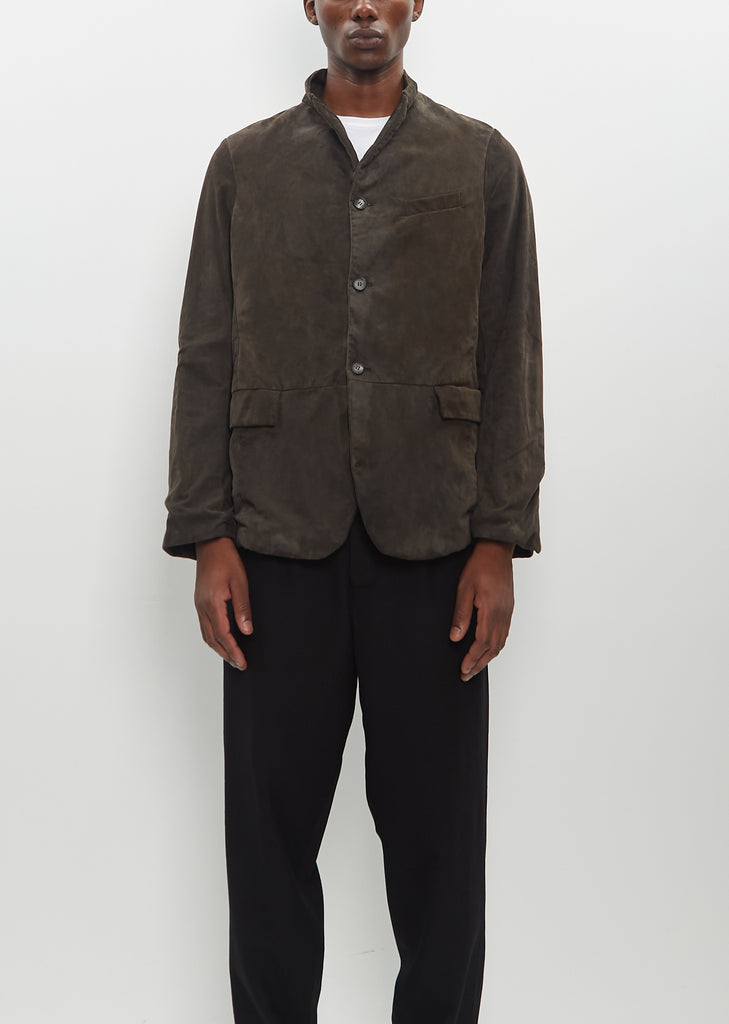 Bergfabel single breasted 3-button jacket with a closer fit in brown taupe suede leather. Features a small notch collar, single chest welt pocket, two front flap welt pockets, two interior slip pockets, buttoned cuffs, and double vent at back. Finished with rumpled effect at cuffs and hem. Comes fully lined in navy cotton fabric.