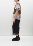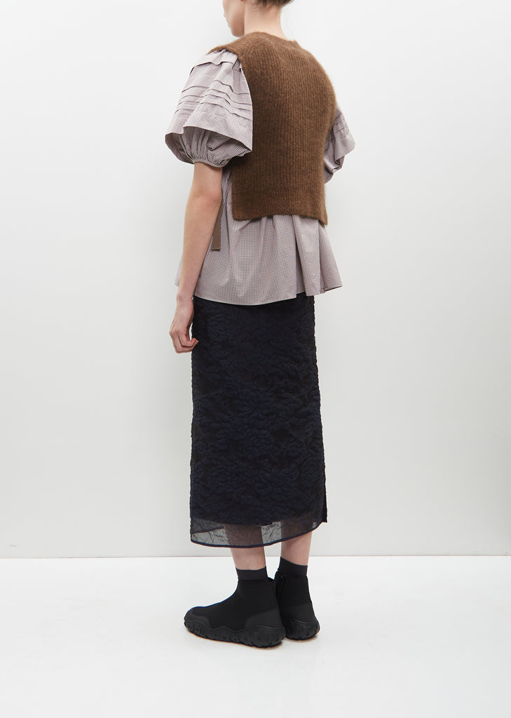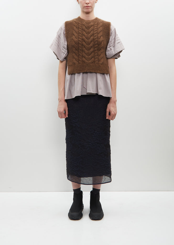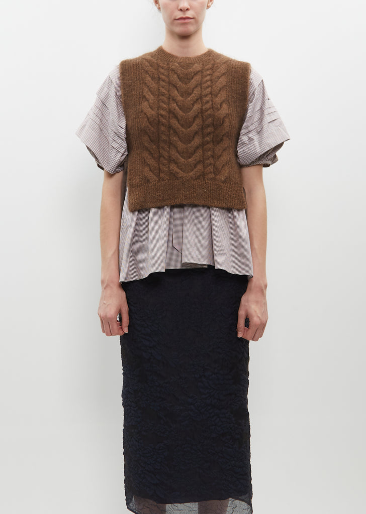 Cecilie Bahnsen brown cropped vest with side bow closures in soft mohair and wool blend cable knit. Features a crew neck and ribbed trim at neckline and hem.