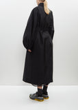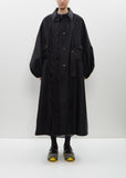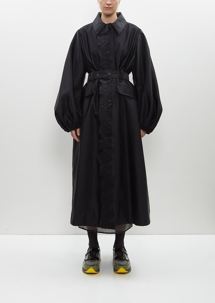 Cecilie Bahnsen black trench coat with signature puff sleeves and floral motif appliqués along placket in nylon. Features pointed collar, adjustable self fabric pin-buckle belt, front flap welt pockets and a concealed button placket with single exposed button at neck. Fully lined in tonal satin fabric.
