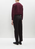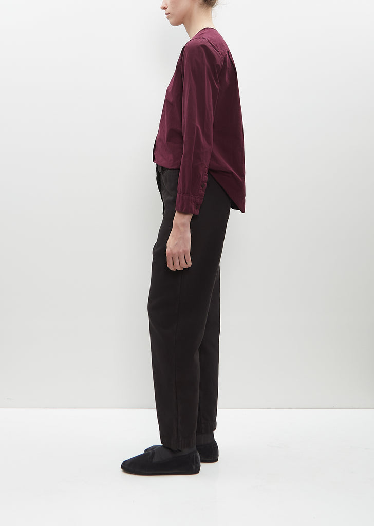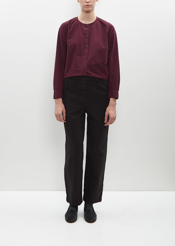 Casey Casey black pant with slightly tapered legs in mid-weight cotton poplin. Features belt loops, angled side pockets, single buttoned patch pocket at back, and button and zip-fly fastening. Finished with tonal buttons.
