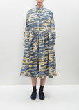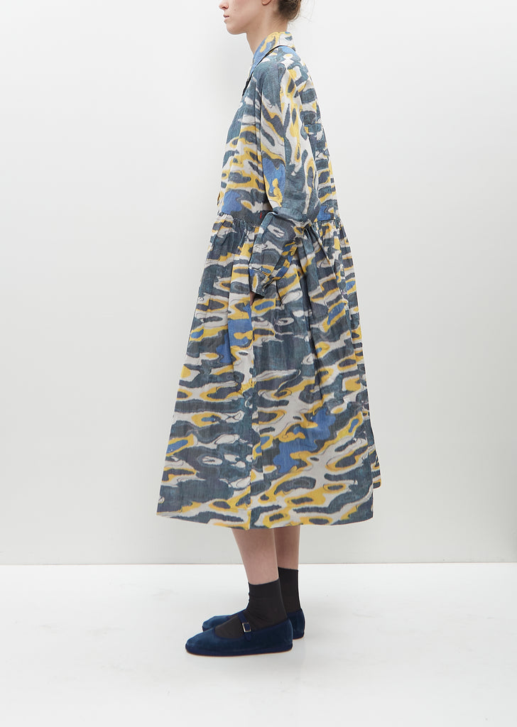 Casey Casey signature shirtdress in ikat print washed mid-weight linen blend. Features a buttoned half placket, three-quarter length sleeves, dropped shoulders, concealed side seam pockets and full skirt with signature side gathers on a slightly dropped waist.