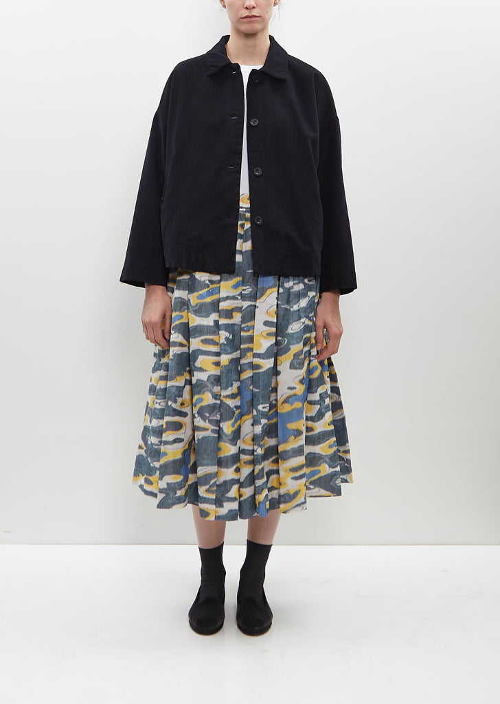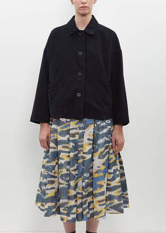 Casey Casey navy single breasted jacket with a spread collar in cotton blend. Features two pleats at back yoke, slightly dropped shoulders and welt side pockets. Lined in black cotton fabric.