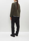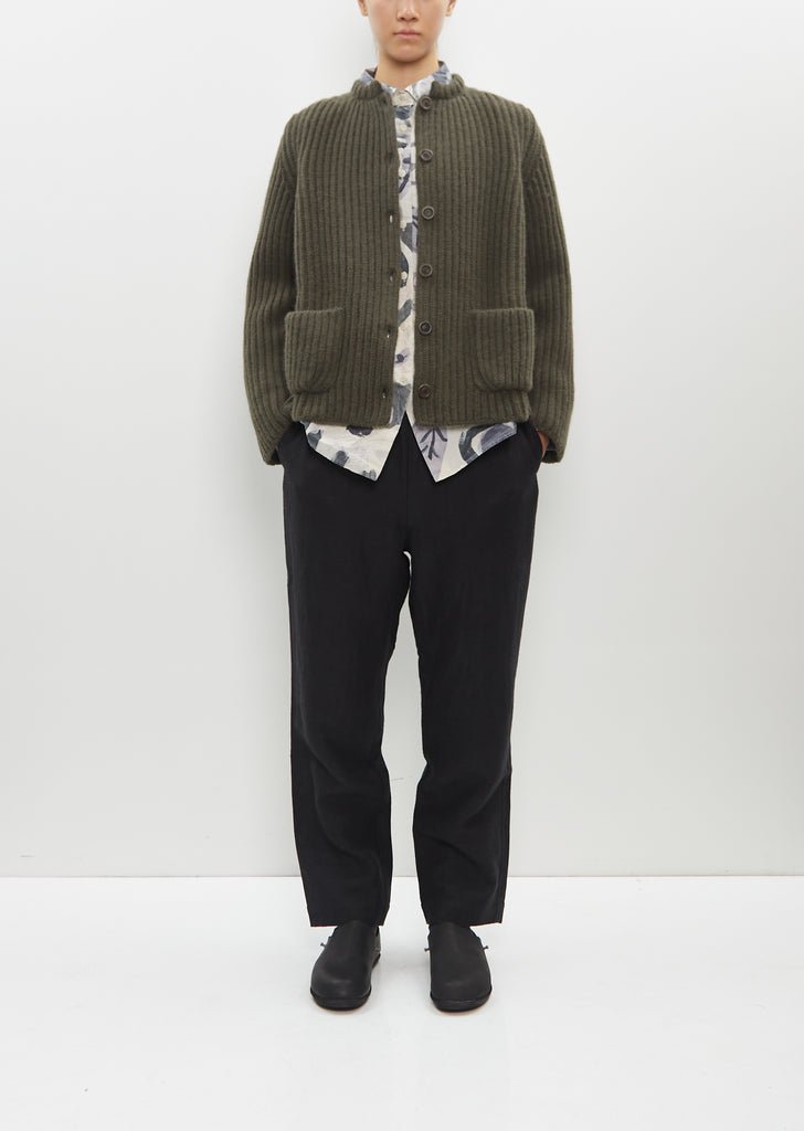 Casey Casey khaki cardigan with a band collar in virgin wool and angora blend. Features patch pockets at front and buttons closure. Finished with tonal corozo buttons.