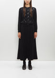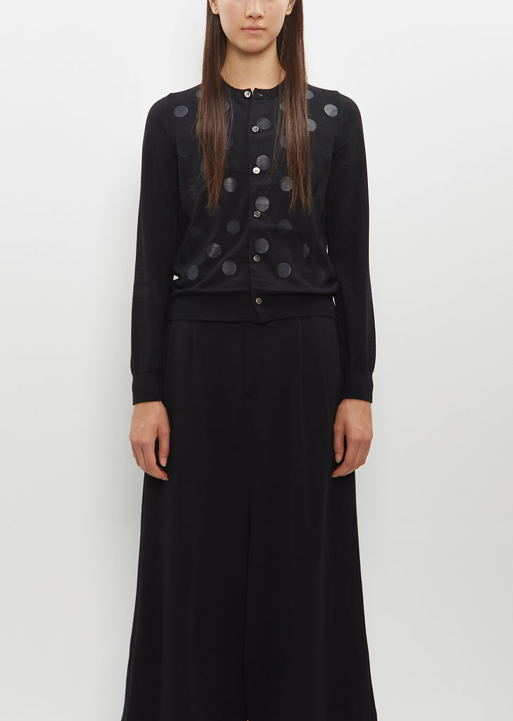 Comme des Garçons Comme des Garçons black cardigan with printed dots and a crew neck in fine wool knit. Features set-in shoulders and a rib trim at neck, cuffs and hem. Finished with shell-hued buttons.
