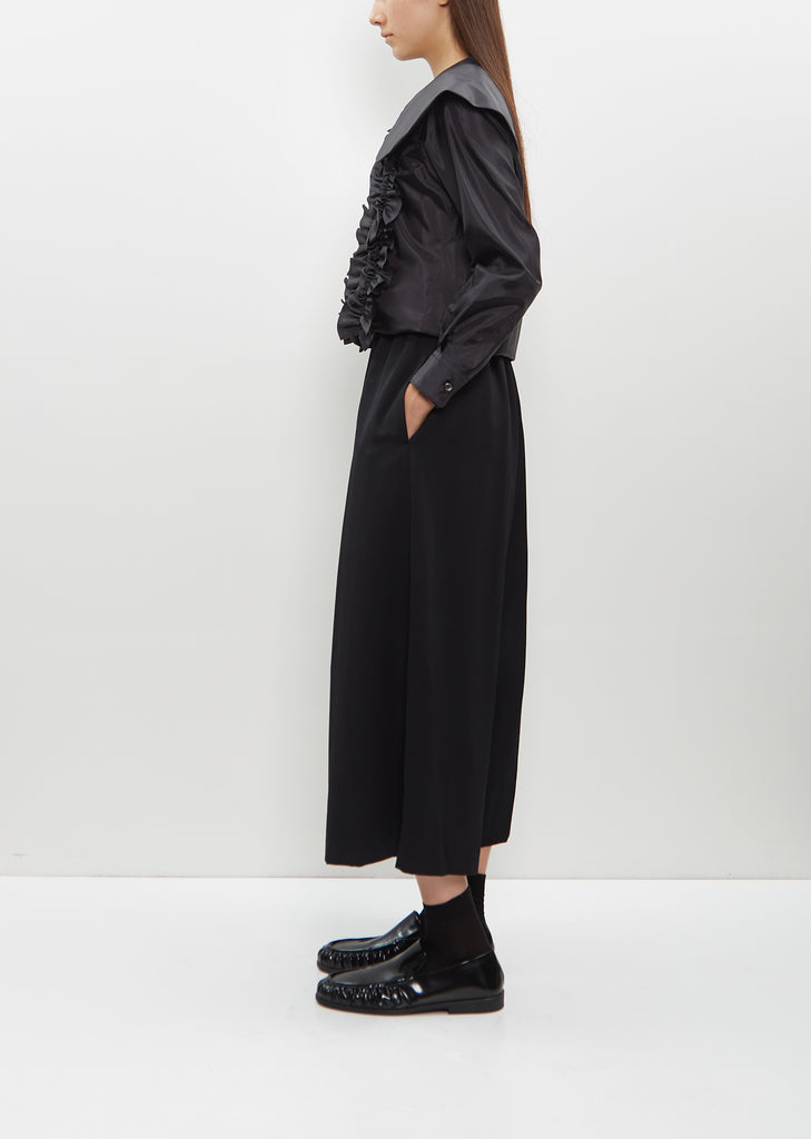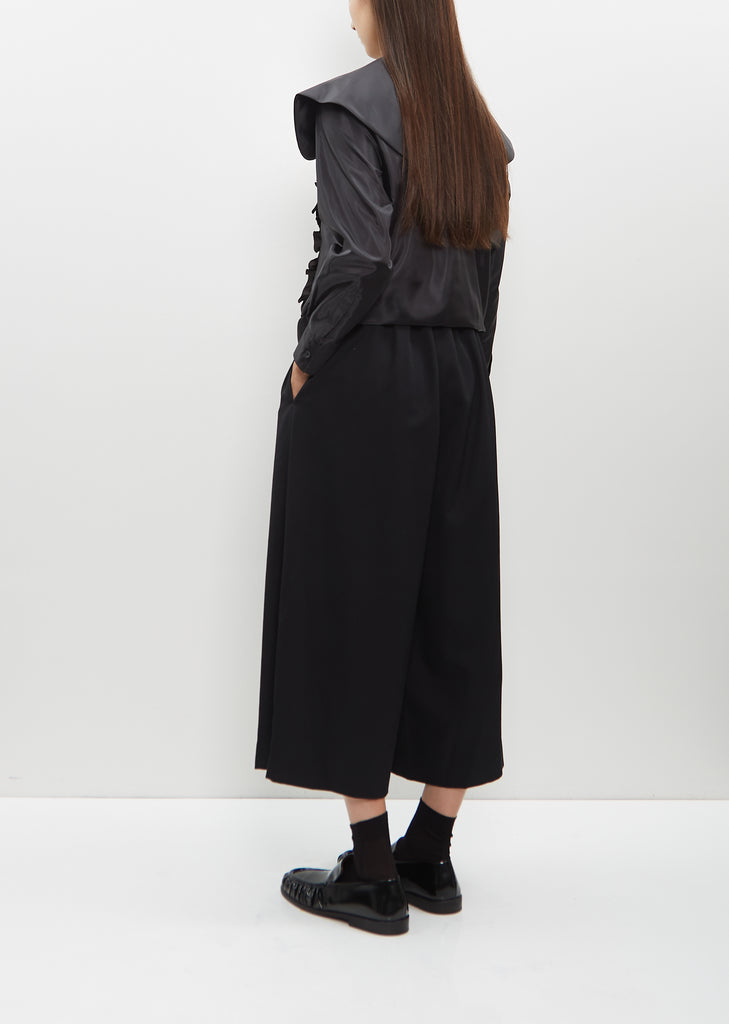 Comme des Garçons Comme des Garçons black pull-on pants with wide cropped legs and an interior adjustable drawstring at waist in cotton. Features an elasticated waist and concealed side seam pockets.