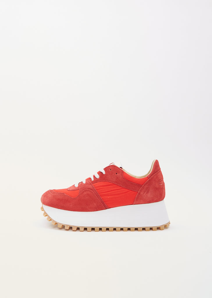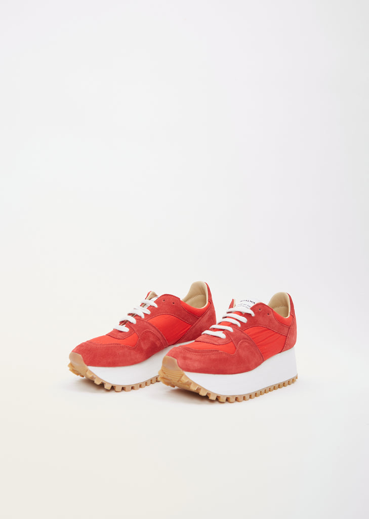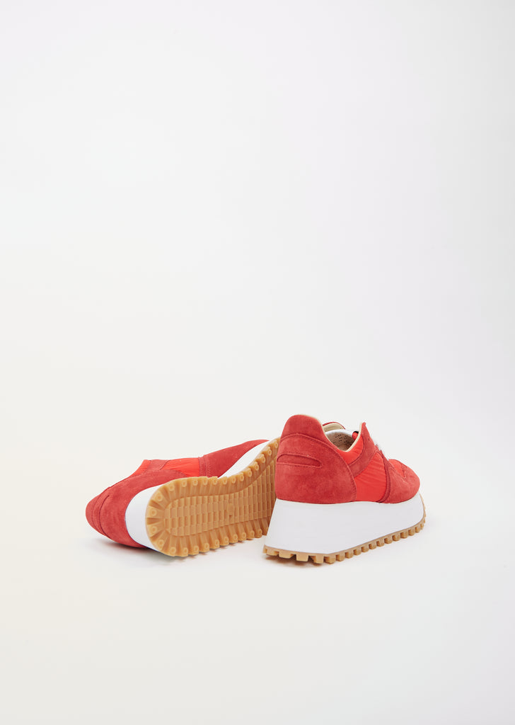 Comme des Garçons Comme des Garçons x Spalwart red marathon platform sneaker with a lace-up front closure in suede leather and cotton. Features a leather insole and a treaded rubber sole.