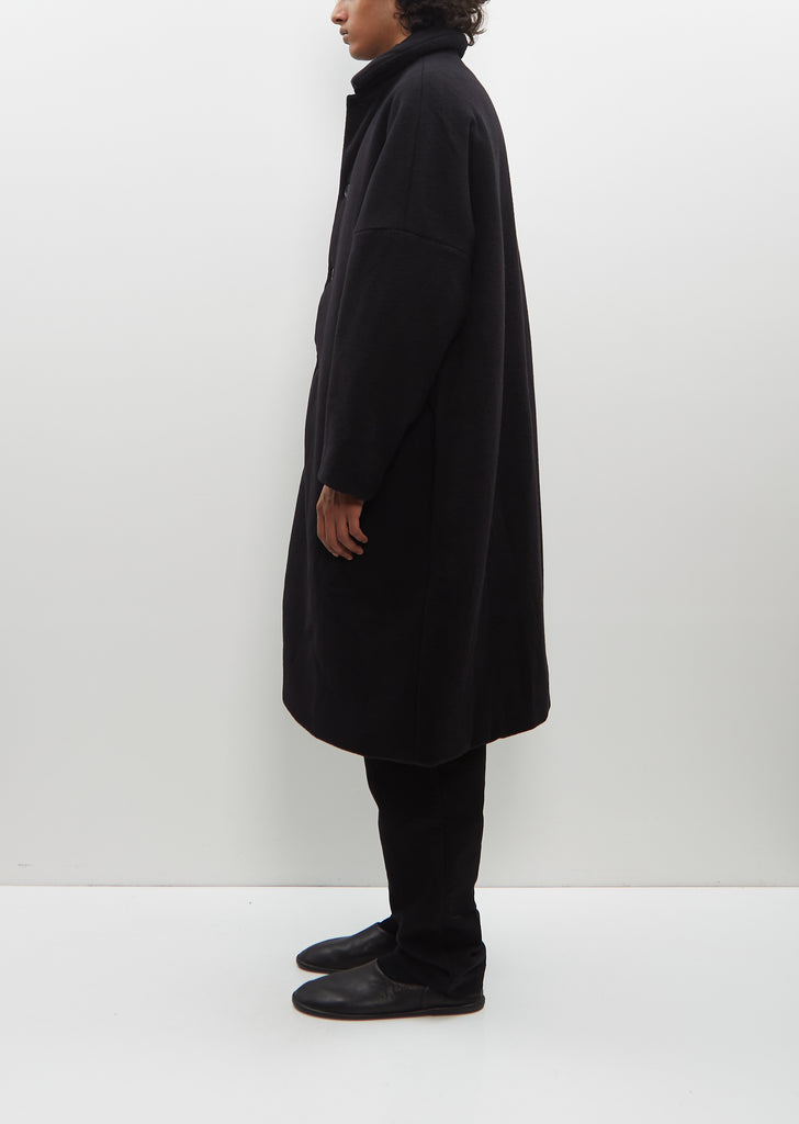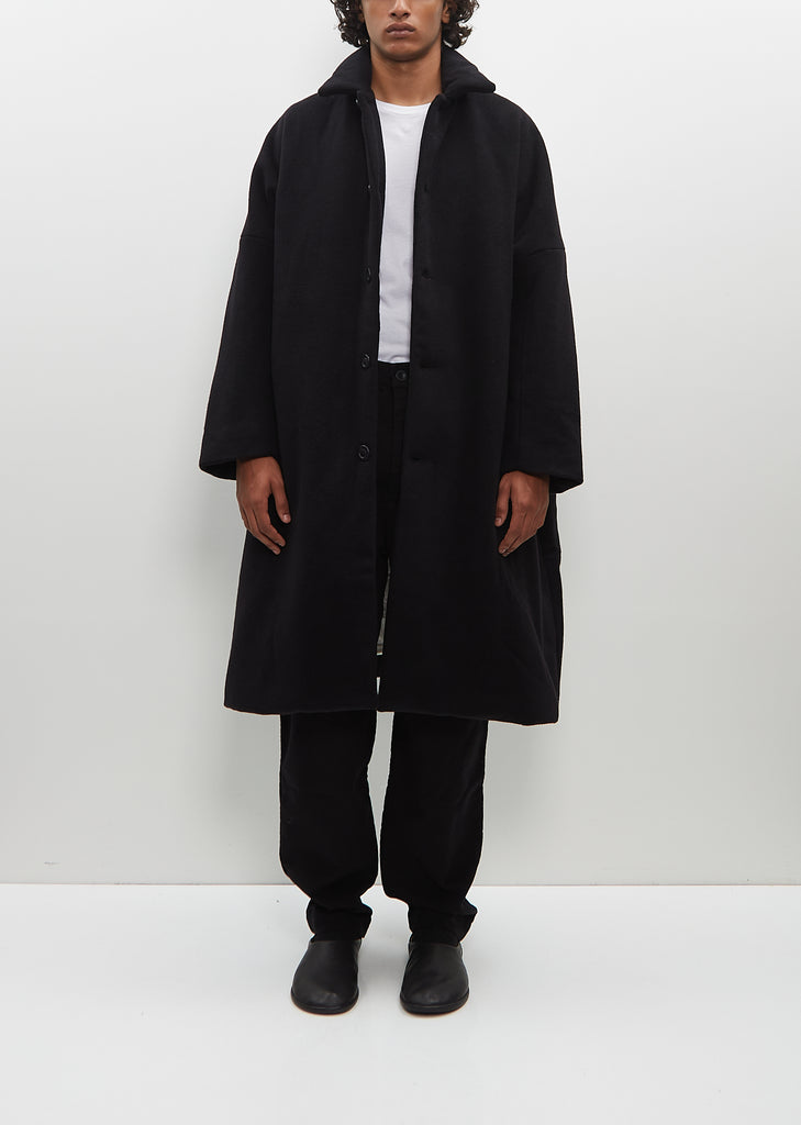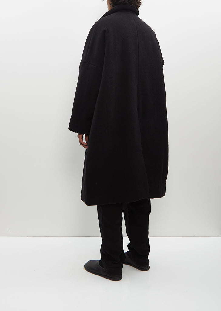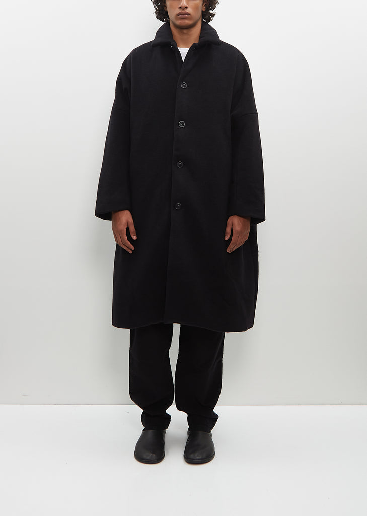 Casey Casey black signature oversized coat in soft cashmere. Features dropped shoulders, angled welt pockets, interior buttoned patch pockets, and deep vent at back. Finished with tonal corozo buttons closure at front. Fully lined in ivory-tone cotton.