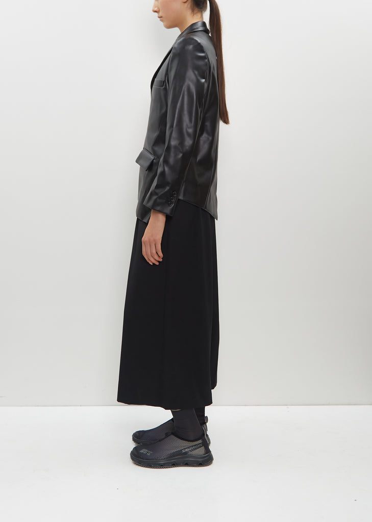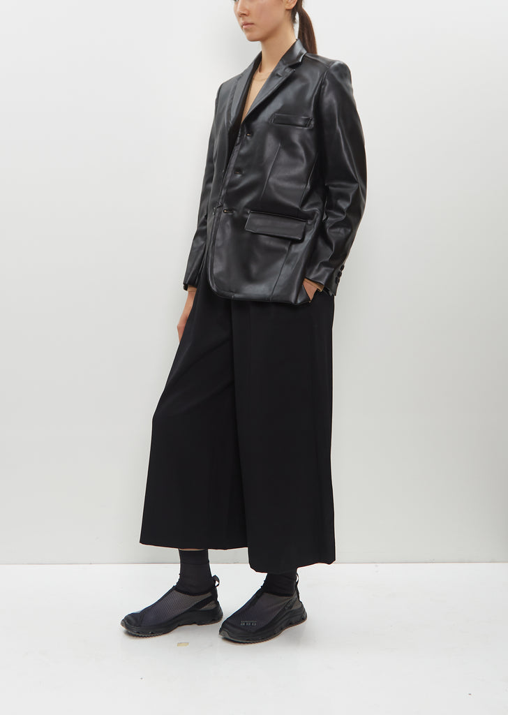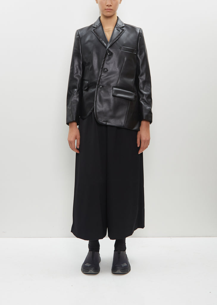 Comme des Garçons black asymmetrical jacket with notched lapels in faux leather. Features a single welt pocket at chest, flap pockets and buttoned cuffs. Finished with horn-hued buttons. Fully lined in tonal cupro fabric. Pockets lined in cotton canvas.
