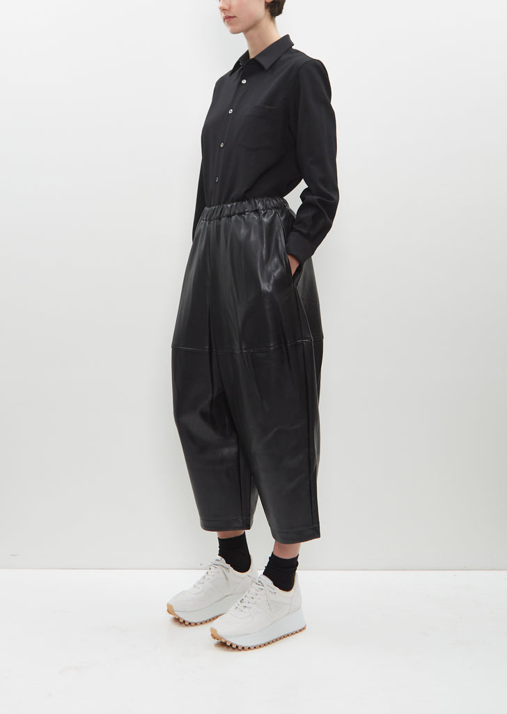 Comme des Garçons black paneled cropped pants with barrel legs and interior adjustable drawstring in faux leather. Features elasticated waist and side seam welt pockets.