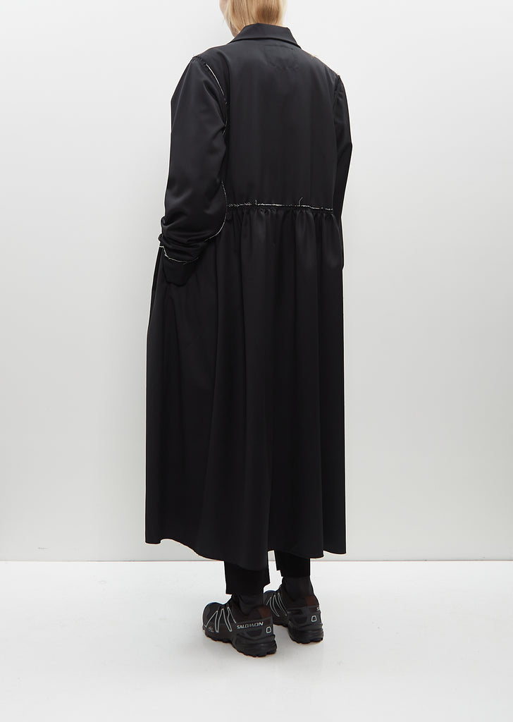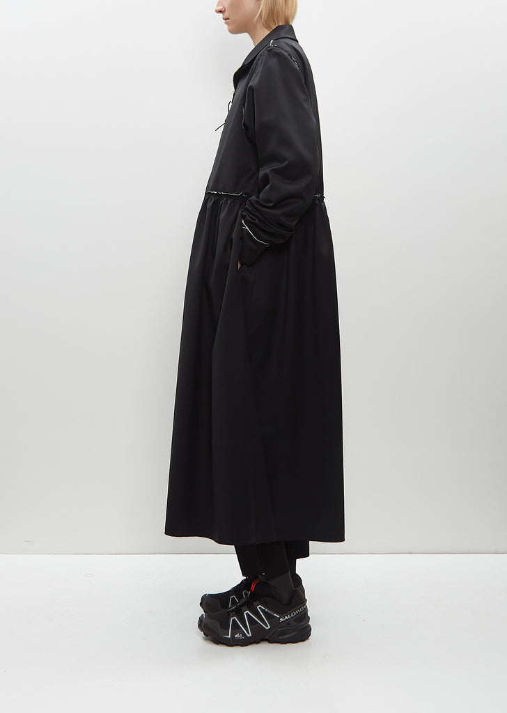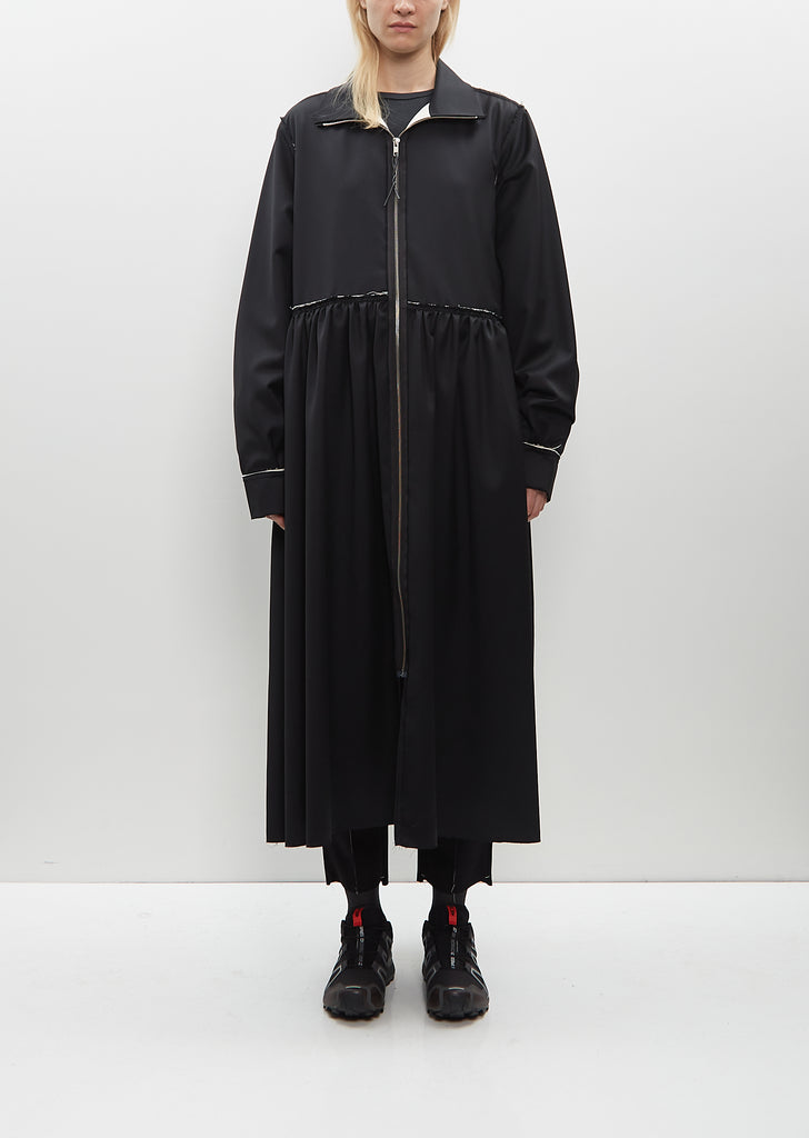 Camiel Fortgens black oversized long sleeve shirtdress with stand-up collar and front zipper closure in wool twill. Features twisted metal toggle, gathered waist, and side seam pockets. Finished with signature raw edge details and inside out seams throughout. Bodice lined in off-white cotton fabric. Relaxed fit.