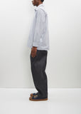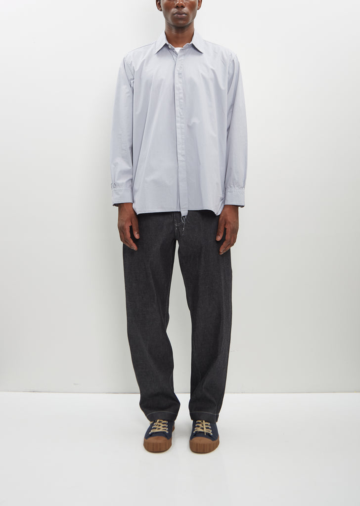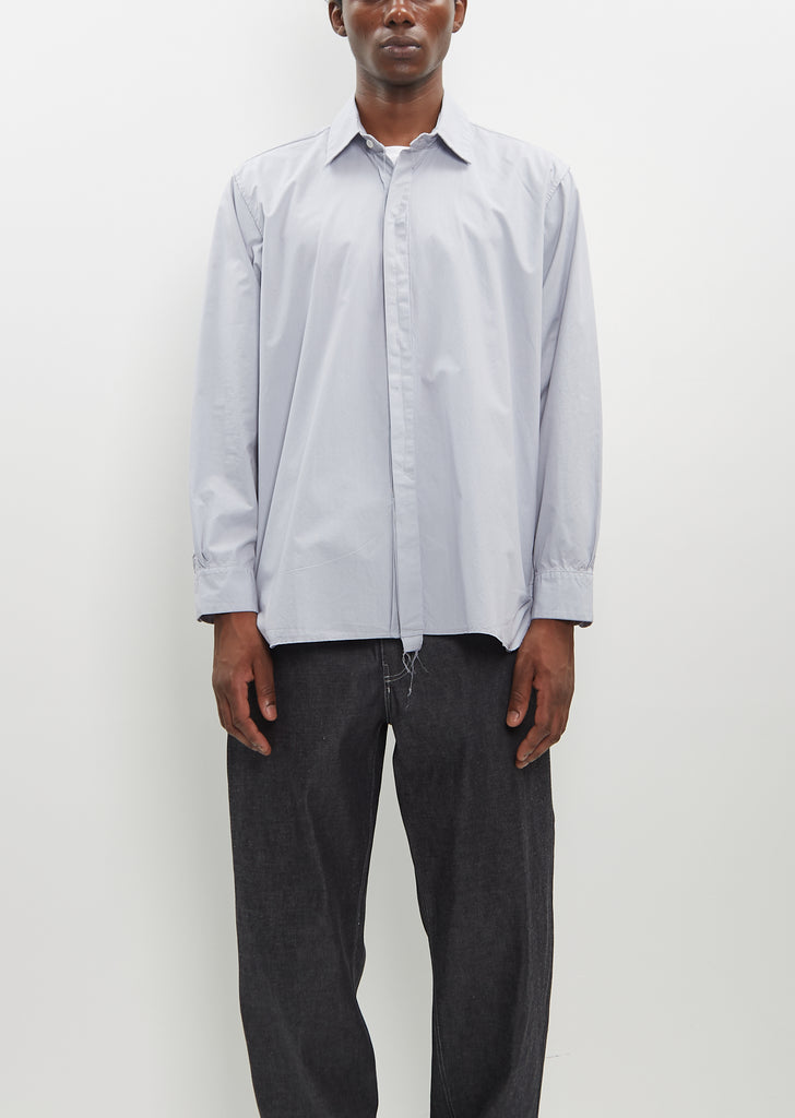 Camiel Fortgens pale blue-grey button-up shirt with inside out seams throughout in cotton poplin. Features pointed collar, concealed button placket, buttoned cuffs, and signature loose thread finish at placket, cuffs, and hem. Finished with mother-of-pearl buttons.