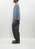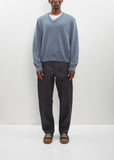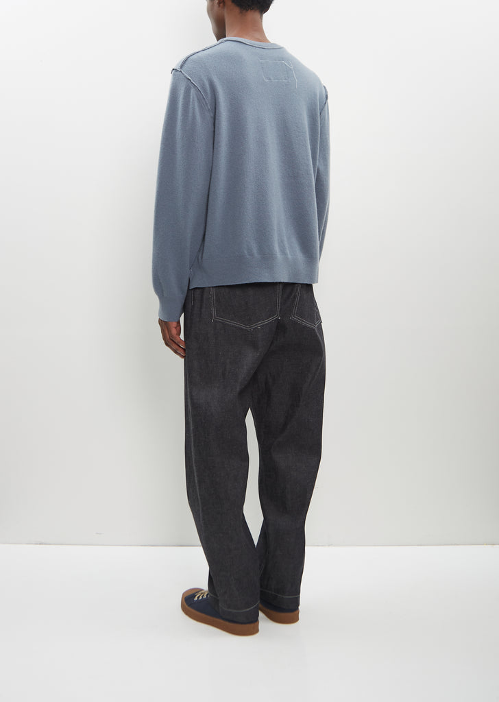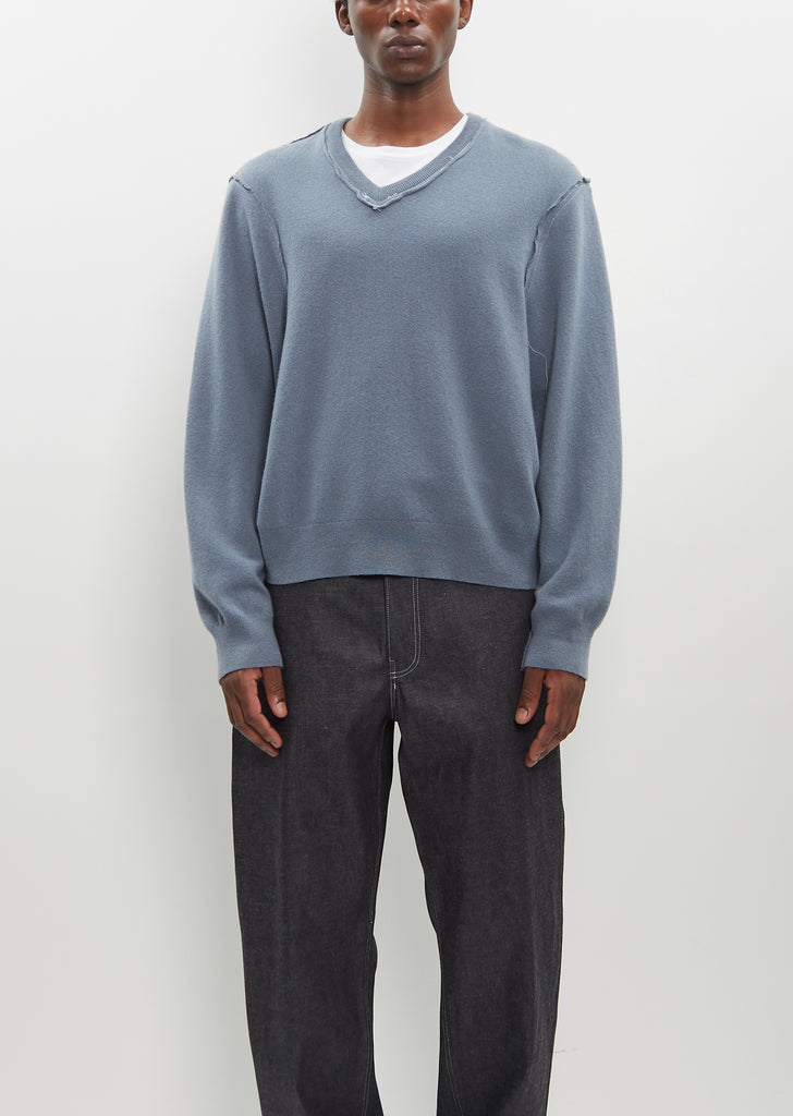 Camiel Fortgens blue-grey off-center v-neck sweater with signature stitched raw edges and loose thread details throughout in cashmere. Features longer back hem and ribbed trim at neckline, cuffs, and hem. Boxy fit.