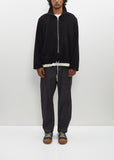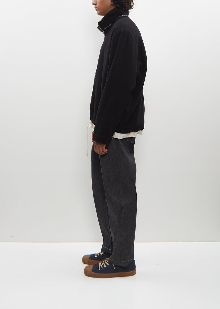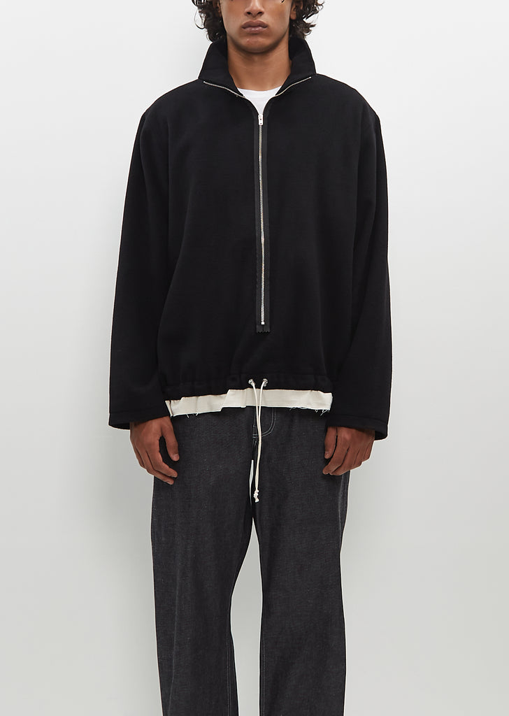 Camiel Fortgens signature black anorak with stand-up collar and adjustable drawcord at hem in a mid-weight wool cashmere blend fleece. Features a front zip closure, zippered side seam pockets, and a natural-tone cotton muslin underlay visible at hem. Finished with signature raw edge details throughout.