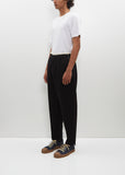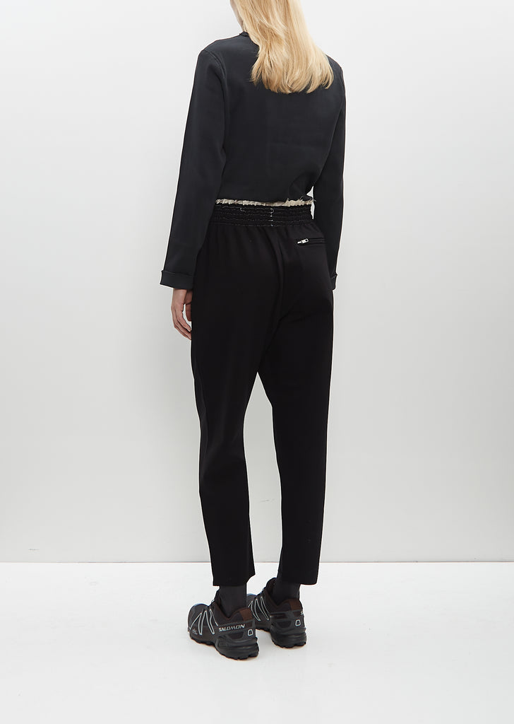Camiel Fortgens black cropped tapered track pants with a contrast cotton muslin underlay visible at waistband in punta jersey. Features an elasticated waist, angle side pockets, pintuck at front legs, and zip pocket at back. Finished with an irregular white top stitching and signature raw edge detailing throughout.