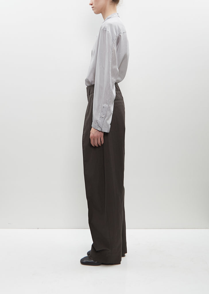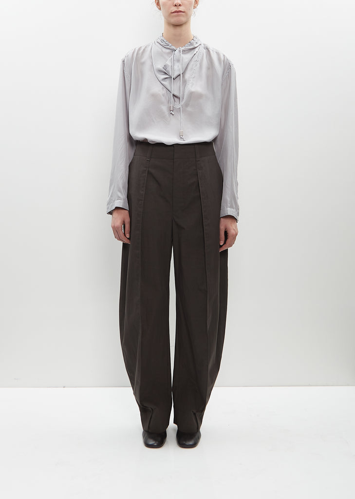 Lemaire dark coffee brown wide leg pants with balloon-like silhouette and front pleats in mélange twill. Features belt loops, side seam pockets, welt pockets at back, and concealed hook and eye zip-fly fastening. Relaxed fit.
