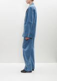 Lemaire snow blue unisex double-breasted workwear-inspired blazer with convertible notched lapel in garment-dyed cotton denim. Features patch pockets, a single interior patch pocket and two-button closure at front. Oversize fit. Comes unlined.