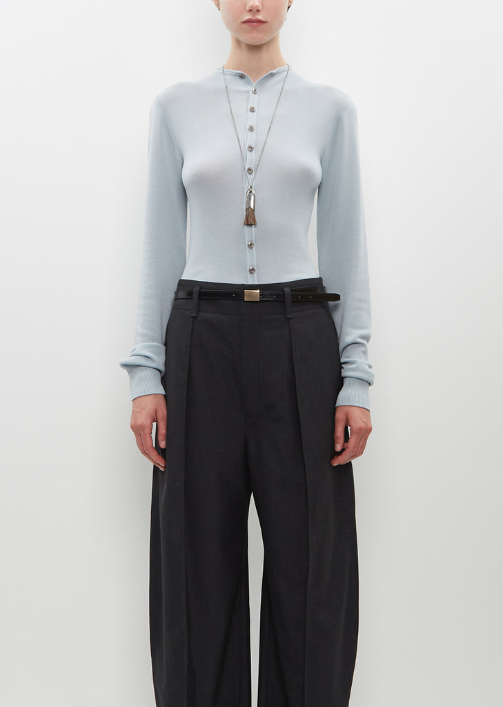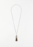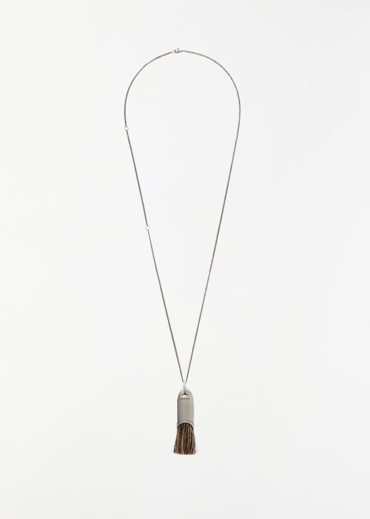 Lemaire personal brush necklace in brass with a silver finish and adorned by a small personal brush made of salt and pepper horse hair. Lemaire signature engraved on the silver metal handle.