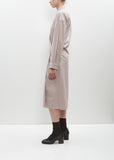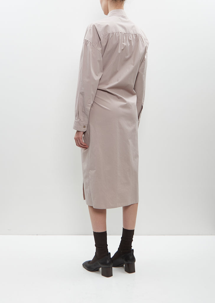 Lemaire violet dress with asymmetrical front drape fastened by single button in crisp cotton poplin. Features a classic collar, buttoned cuffs, interior tie fastening and a half placket with Mother-of-pearl buttons closure at front. Relaxed fit.