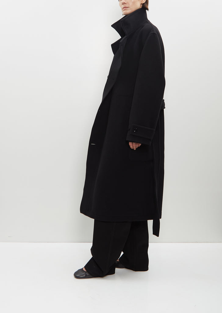 Lemaire black coat with a wrap front in heavyweight wool. Features a funnel neck, self waist tie, oversized patch pockets, single interior patch pocket, and button tab cuffs. Finished with tonal buttons.