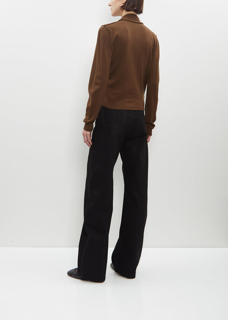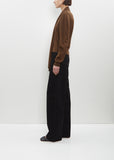 Lemaire hazelnut brown cardigan with optional wrap front styling and incorporated scarf in soft wool blend knit. Features a brown buttons closure at front. Finished with a rib trim at cuffs and scarf hem.