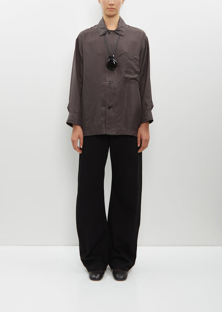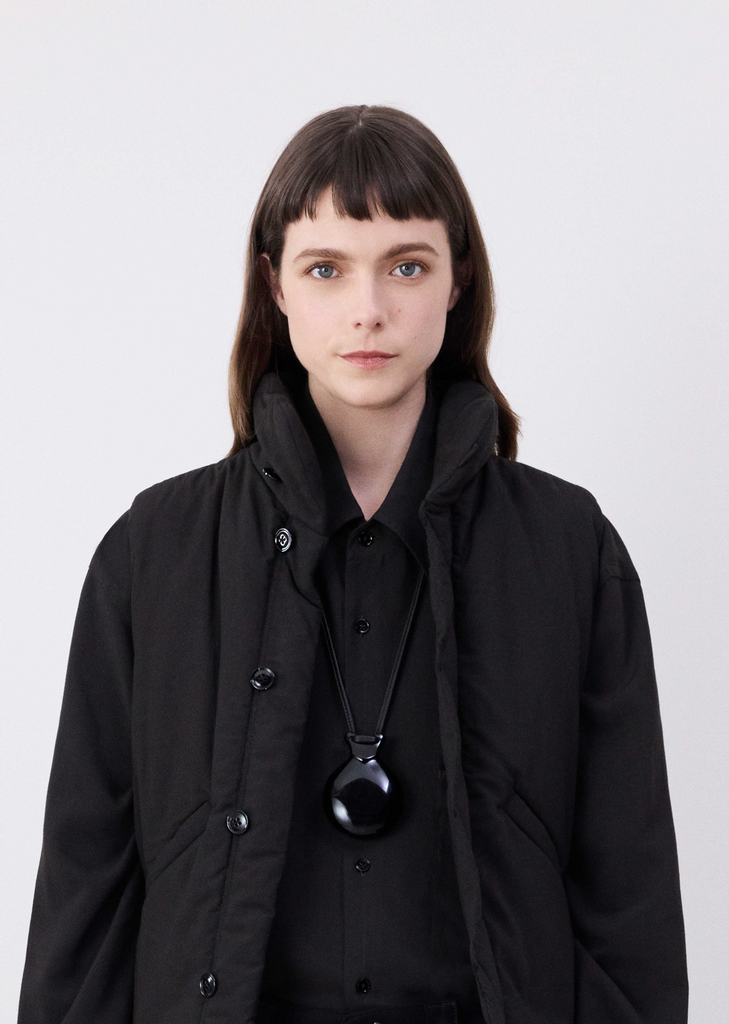 Lemaire unisex accessory composed of lacquered resin ‘castanets’ that take after the handheld instruments traditionally played by flamenco dancers. Each side encloses a mirror one classic, one enlarging and are held together by a knotted nappa leather neck cord.