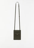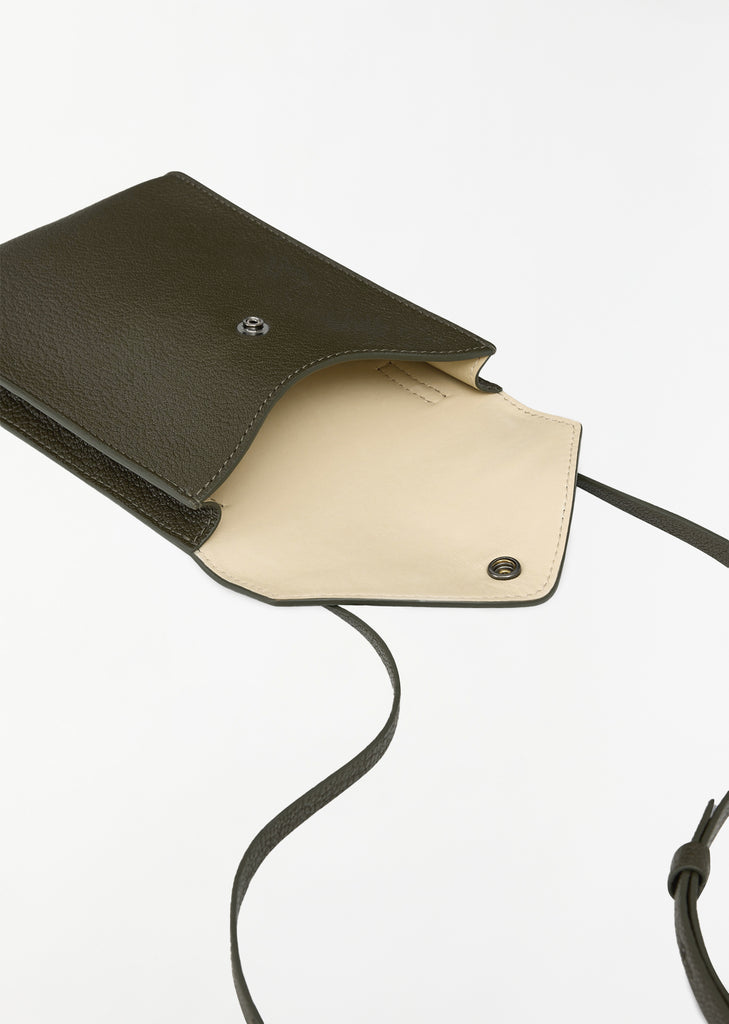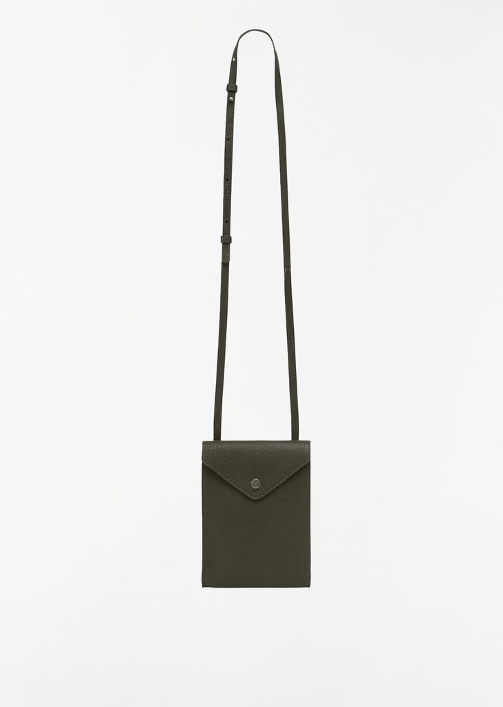 Lemaire signature envelope crossbody bag in pesto green grainy leather. Features an adjustable strap, envelope front closure with snap and a small envelope pocket with snap closure at the back. Fully lined in contrast tan leather.