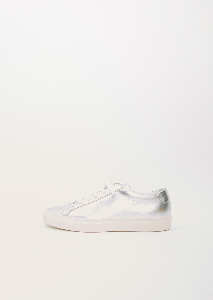 Common Projects silver low-top lace-up sneaker with a round toe in nappa leather with a reflective finish. Fully lined in soft white leather with a padded tongue and leather insole. Finished with white cotton laces and signature gold foil style numbers on outer heel.