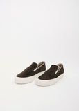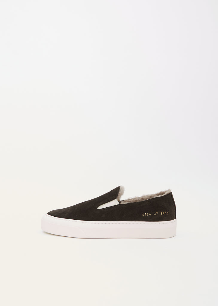 Common Projects brown low top slip on sneakers in suede leather. Fully lined in soft beige shearling with a leather insole and an off white rubber outsole with a treaded sole. Finished with signature gold foil style numbers on outer heel.