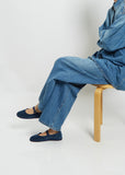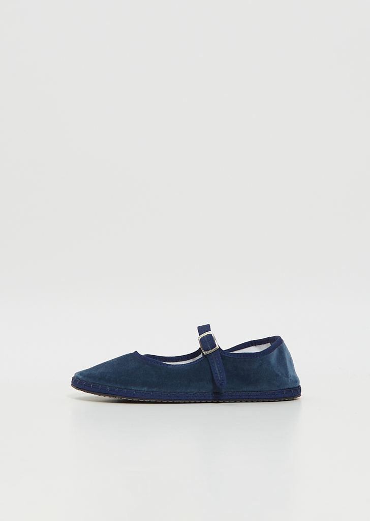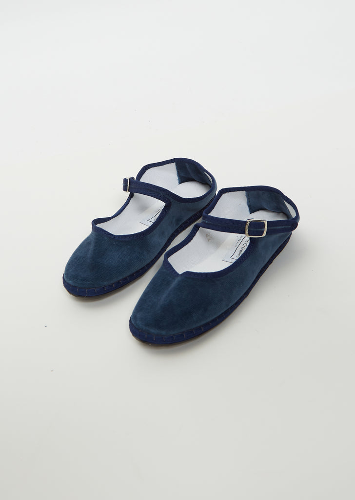 Drogheria Crivellini denim blue mary jane with a faux polished silver buckle and snap fastened strap closure in soft velvet. Features a sustainably constructed rubber sole made from recycled bicycle tires with contrasting white stitching. Finished with tonal grosgrain trims.