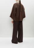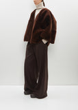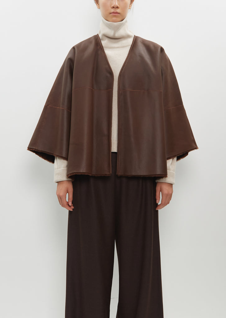 Dušan dark brown open jacket in reversible smooth leather and luxurious shearling. Features a V-neckline and kimono sleeves.