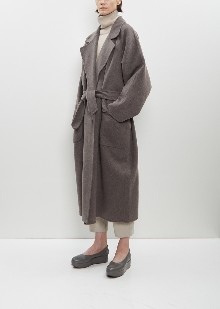 Dušan dove grey mélange double-breasted relaxed coat with a wide notch collar and deep flap pockets crafted in pure cashmere. Features a open front, relaxed sleeves on a raglan shoulder, and removable self belt. Detailed with a back slit. Fully lined in self.