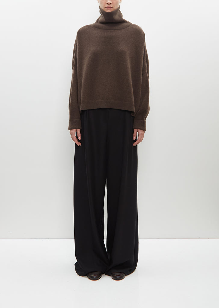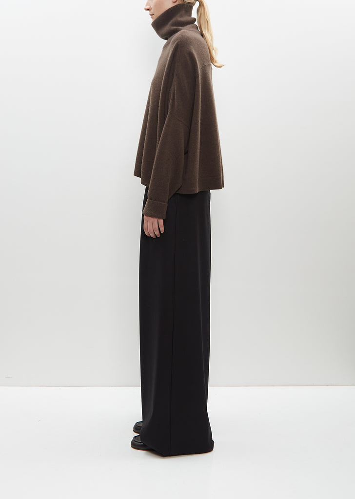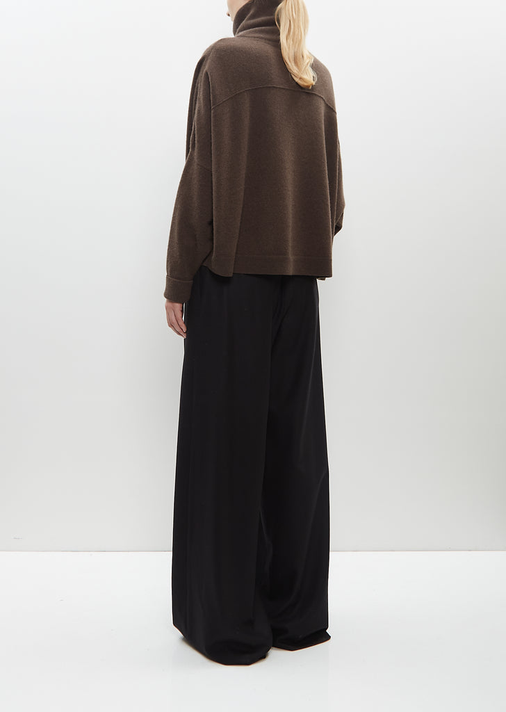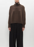 Dušan dark brown turtleneck sweater knit in heavyweight pure cashmere. Features a slightly cropped length, boxy silhouette, dropped shoulders, and a pronounced yoke seam. Finished with ribbed trim along cuffs and hem.