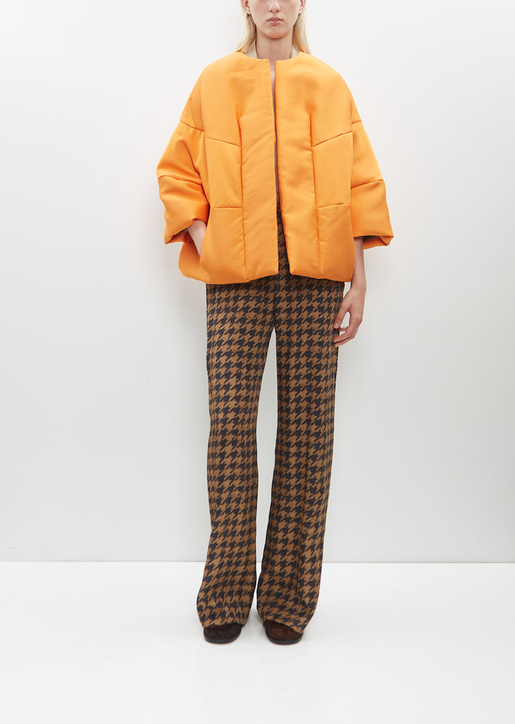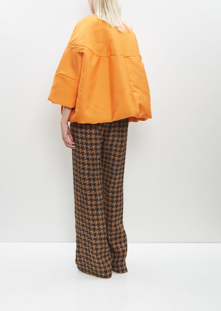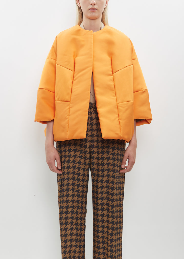 Dries Van Noten orange open padded jacket with kimono-style 3/4 sleeves and an open front in silk blend. Features a single interior slip pocket, and slip vertical pockets lined in fleece. Comes fully lined in beige satin fabric.
