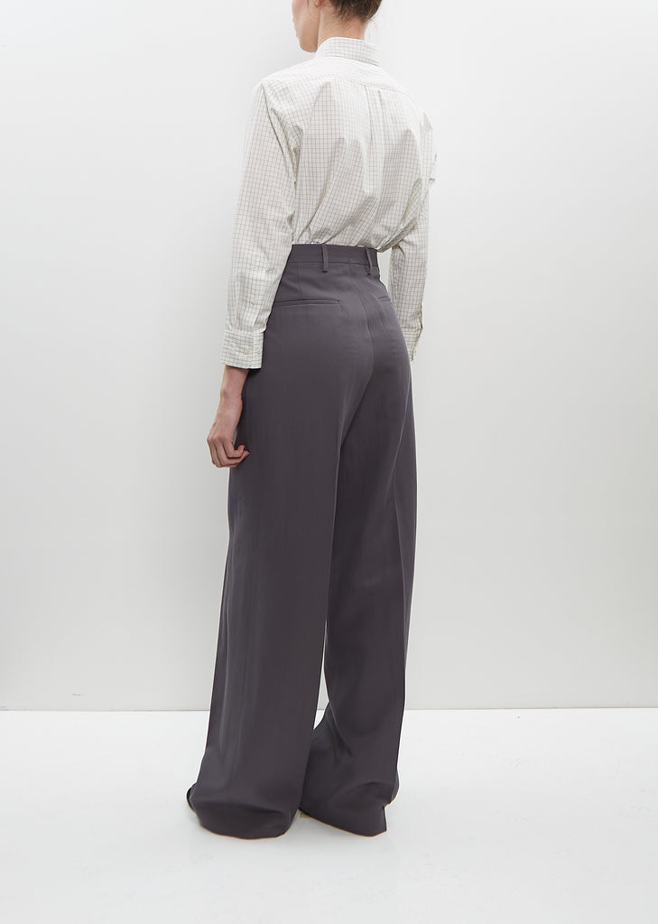 Dries Van Noten taupe pants with wide legs and a front pleat in wool blend. Features belt loops, angled side pockets, welt pockets at back and hook and eye zip-fly closure.