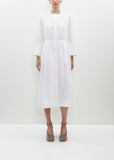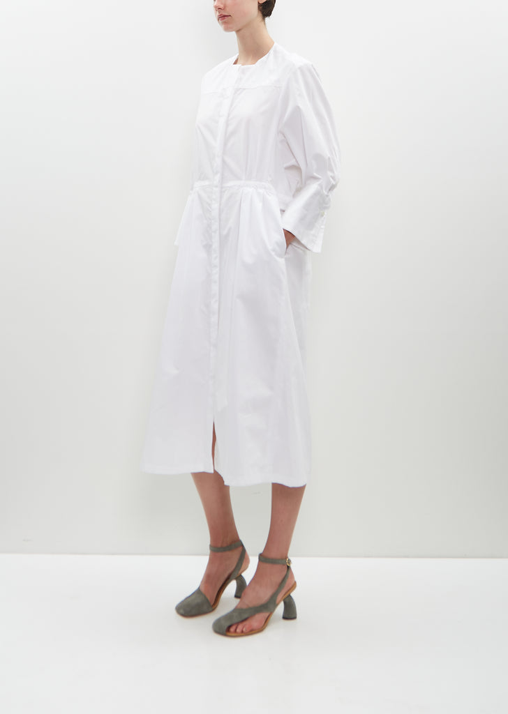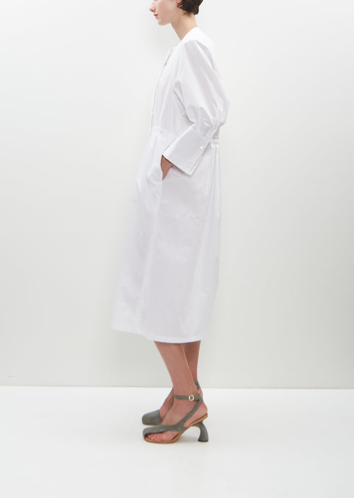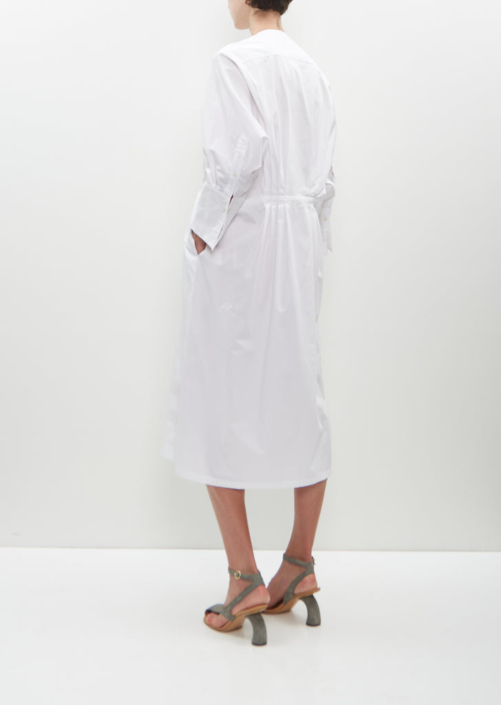 Dries Van Noten white tunic dress with a pleated cinched waist with inner drawcord and elongated buttoned cuffs in cotton poplin. Features a round neck, dolman sleeves, a front and back yoke, and a concealed buttons closure at front. Finished with nacre-hued buttons.