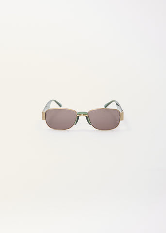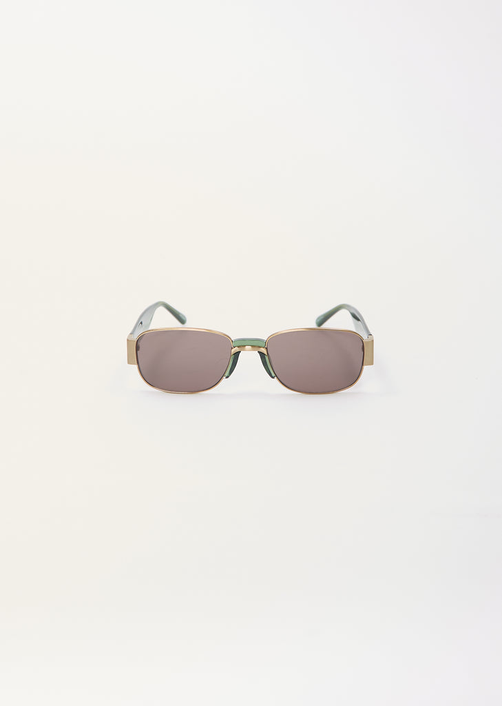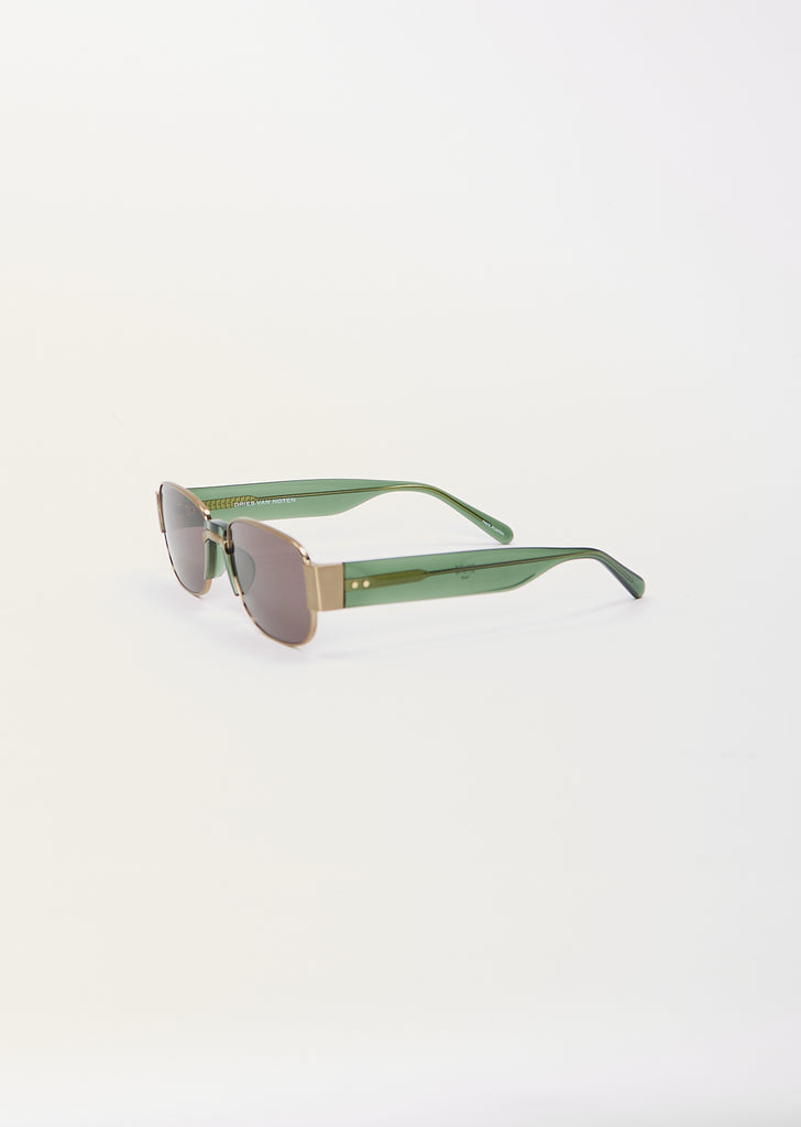 Dries Van Noten green and brown rectangular sunglasses with antique gold-toned metal frames and acetate nose bridge detail and temples.