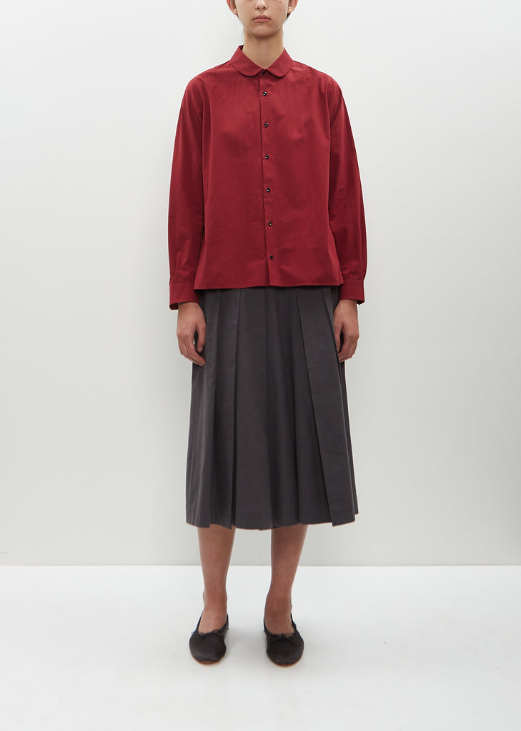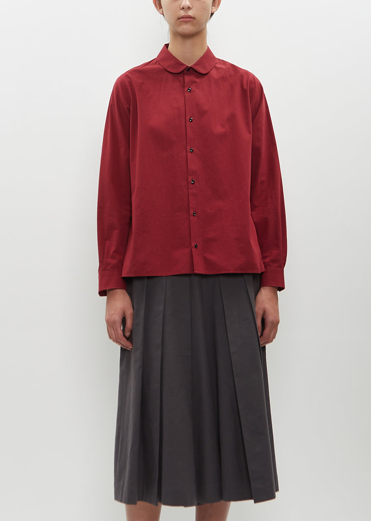 École de Curiosités red button-up shirt with a rounded collar in brushed cotton shirting with a soft, warm hand. Features slightly dropped shoulders, split detail side seams and pleated cuff sleeves.  Finished with tonal buttons.  Straight, boxy cut.