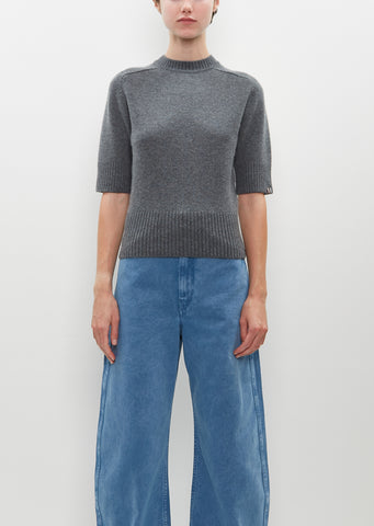 Extreme Cashmere dark grey crewneck top with a closer fit at waist in a luxurious heavy-weight cashmere knit with slight stretch. Features elbow-length sleeves and a wide rib trim at neck, cuffs and hem.