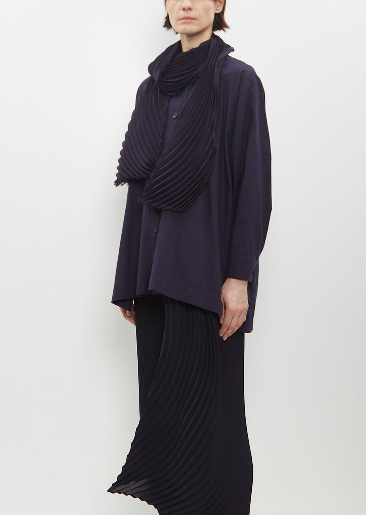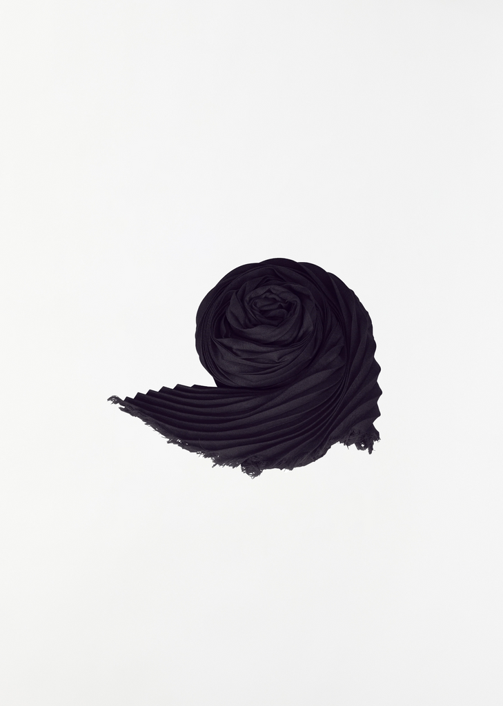 Issey Miyake navy stole with raw edges in silk blend semi-sheer pleated chiffon.