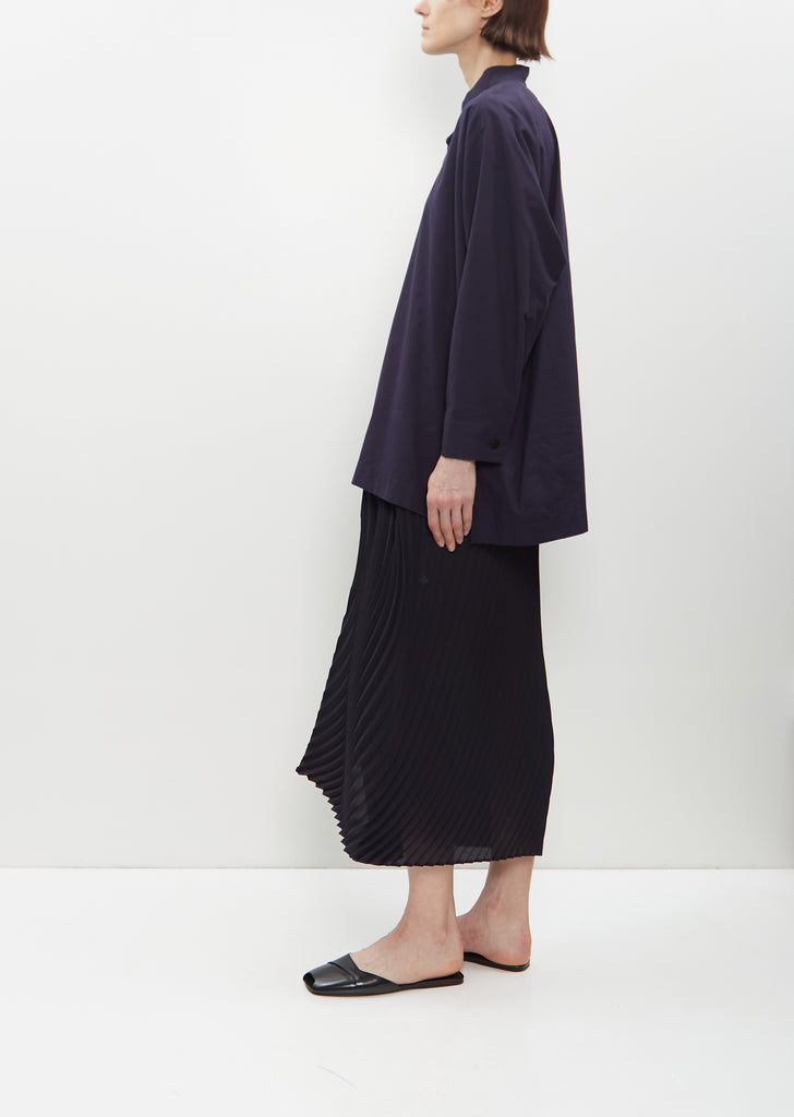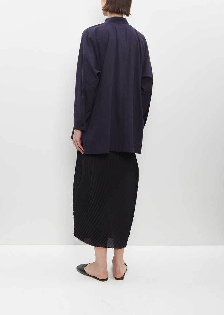 Issey Miyake navy shirt with a band collar and dropped shoulders in soft cotton. Features pleated buttoned cuffs, a shirttail hem and a buttons closure at front.
