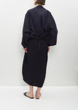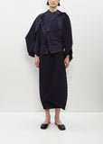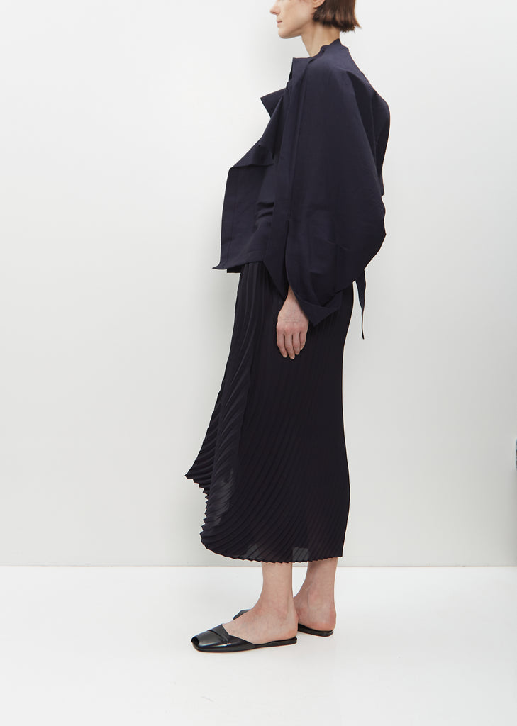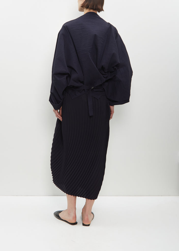 Issey Miyake navy asymmetrical jacket with wide kimono sleeves and pleated details in mid-weight paper and nylon blend technical twill. Features an adjustable tab at back and a tonal zipper closure at front.