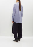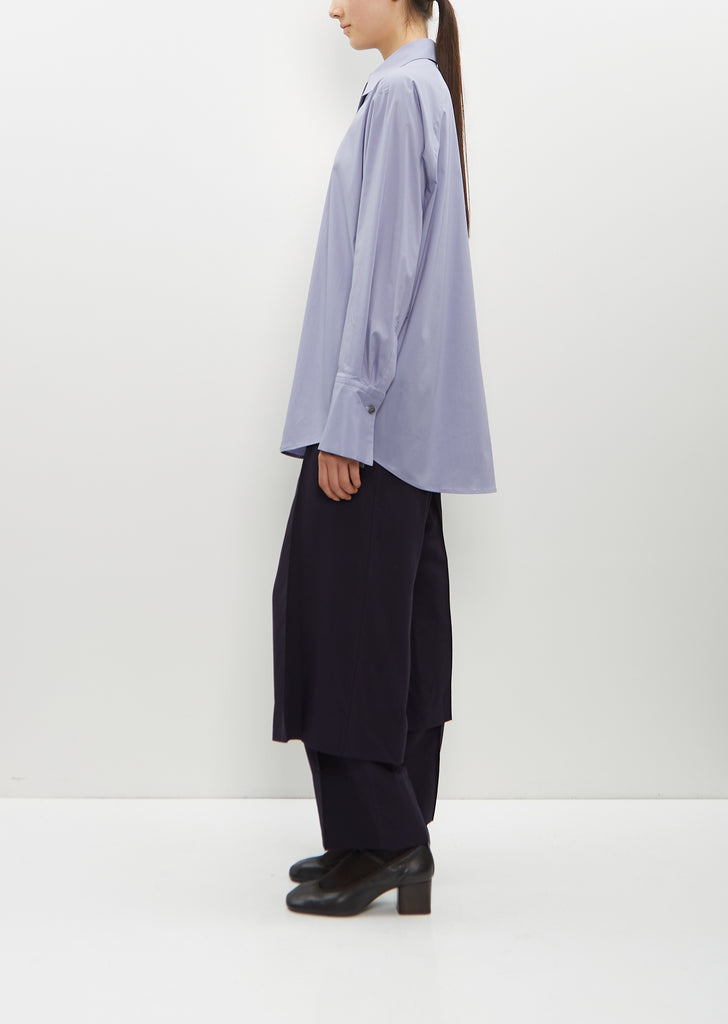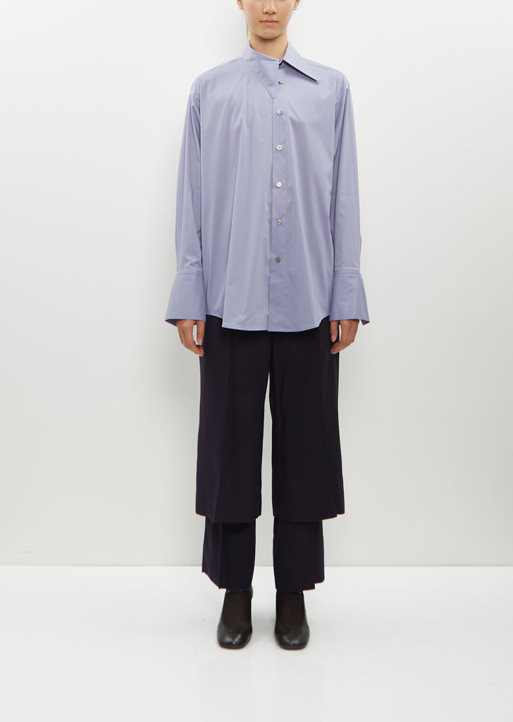 Issey Miyake light purple blue long sleeve shirt with an off-center pointed collar and placket in cotton and nylon twill. Features elongated buttoned cuffs and a pleat at center back. Finished with shell-hued buttons.