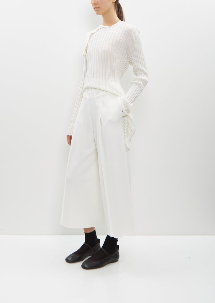 Issey Miyake frost white cropped pull-on pants with a center seam detail at front legs in cotton and nylon blend knit. Features an elasticated deep waistline, slightly fringed center seam detail on back pant legs and side seam pockets. Overlock finish seams throughout.