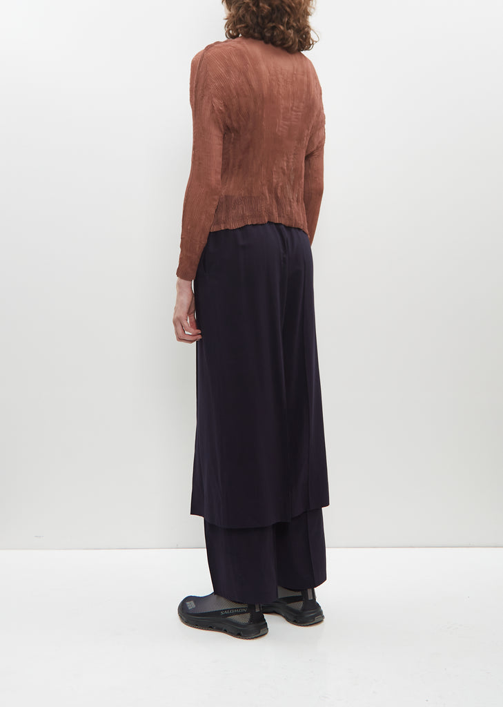 Issey Miyake brown cardigan with round neckline and a tonal buttons closure at front in sheer finely pleated chiffon. Closer fit.