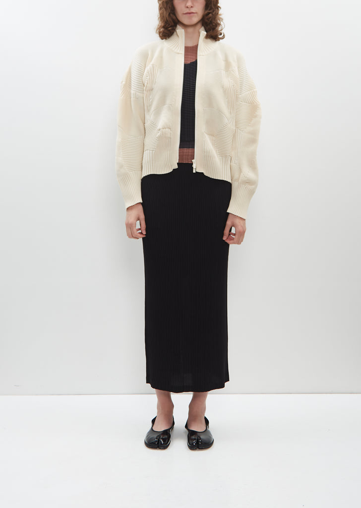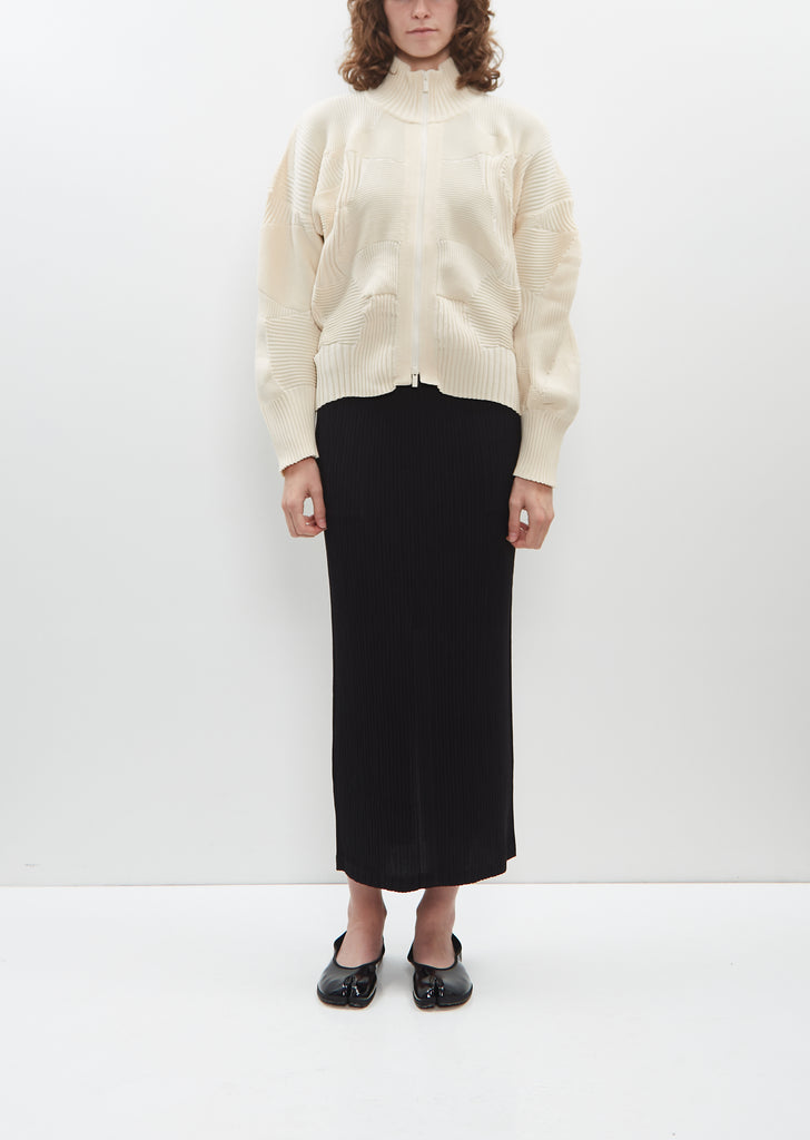 Issey Miyake off-white signature zip-up jacket with a high neck and tonal double zip closure in patchwork ribbed knit. This knitting technique is created by combining multiple knitting patterns and is finished with a curved, asymmetrical hemline. Slight cocoon silhouette and relaxed fit.